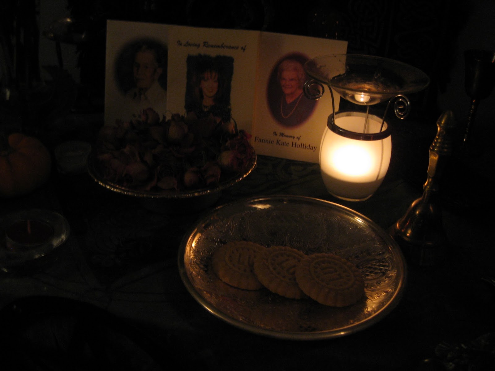All-in-all a very good, very cleansing ritual. Took the last of the food offerings outside and placed them under the tree. Was a beautiful night. If anyone has any Samhain altar photos that they would like to share here, please shoot me an email at goddessdaughtergems@gmail.com and I will gladly post them or links to them here.